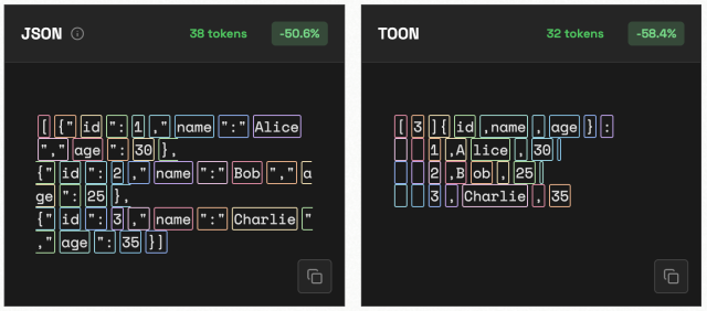If you’ve worked with LLM APIs before, you’ve likely seen how LLMs use JSON to pass structured data. JSON is also just text, and the entire JSON content gets tokenized like any other string. Because of this, formats that reduce the amount of text can meaningfully change the token cost of what you send to a model. This is part of what has driven the recent interest in alternatives like TOON, discussed above. Below is a comparison of JSON and TOON formats for the same text. Note the different token counts.