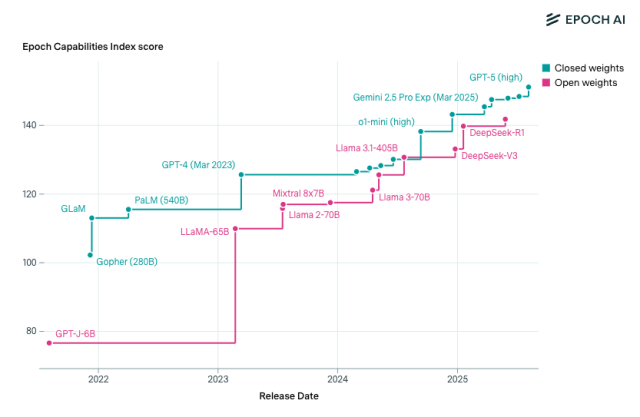An open-weights model from Moonshot AI, Kimi K2 Thinking, was also released last week. While still rough around the edges, the model uses tools very well and often writes more eloquently than Claude Sonnet 4.5 or GPT 5.1. A few weeks ago, the AI research organization Epoch AI released this graph, arguing that the capabilities of the leading open-weight models are only about three months behind those of closed-weight ones: