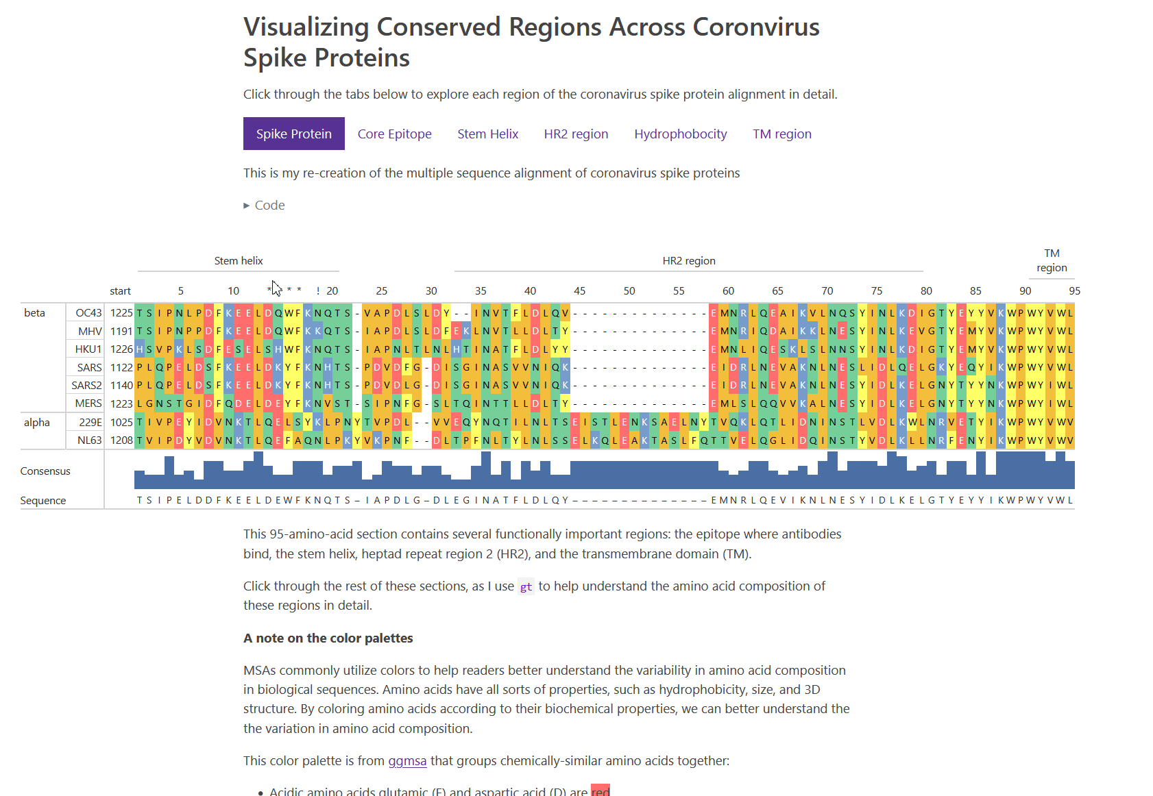 This table submission is remarkable for its audacity: multiple sequence alignment has its own established tooling, yet here's someone doing it with gt and it actually works! It’s obvious to me that the author saw a table package not as a constraint but as a canvas for domain-specific visualization. Maybe the future of bioinformatics might involve more Quarto documents with/ tables and fewer standalone desktop applications?