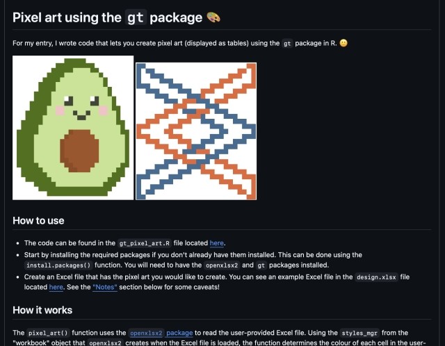 Pixel art is awesome. This entry makes it so easy to translate Excel art into gt tables. This pipeline from pixel art authoring to final rendering via gt is brilliant! As I used the tools for my own modest creations, I felt the joy of creating something fresh and new. With steady practice, I hope to keep making better and better aRt with Excel and gt!