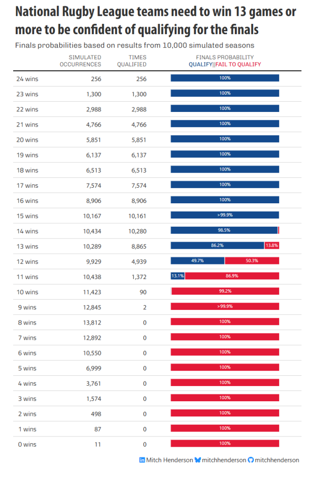 This table turns 10,000 simulated rugby league seasons into one beautiful, instantly readable answer: "How many wins do we need to make the playoffs?" Those stacked bar charts showing the blue/red split between qualification and elimination tell a story that raw percentages can't. It's a great example of turning complex probability into actionable insight.
