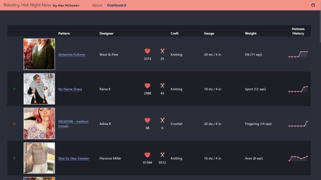 This table is pure fiber arts magic! It transforms Ravelry's "hot right now" click-through into an instant visual feast. The greatness lies in the sandwich technique: technical specs (gauge, yarn weight) nestled between eye candy (clickable pattern photos and that delightful 7-day hotness sparkline). This table is what happens when someone deeply understands their users and builds exactly the tool they wish existed.