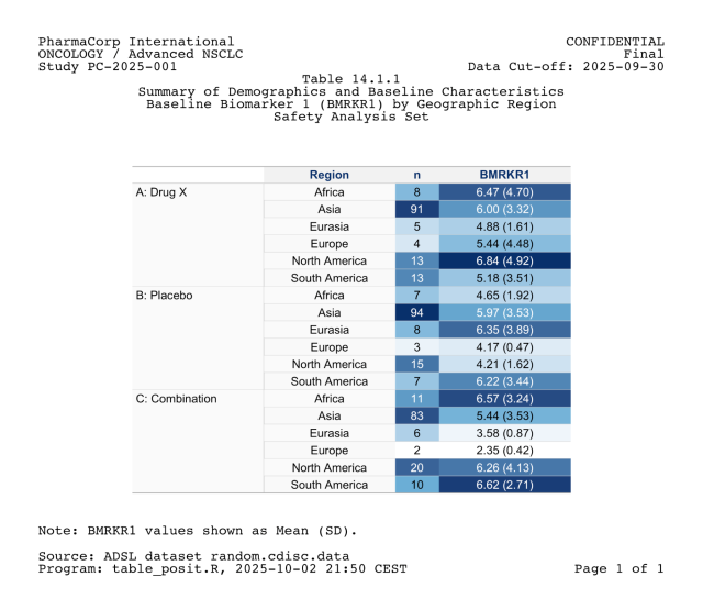 This submission provides the means to create submission-ready table artifacts with protocol numbers, data cutoff dates, confidentiality notices, and complete traceability metadata. Built by combining {gt} for elegant styling with {gridify} for regulatory-compliant framing, it transforms CDISC baseline characteristics into something that would absolutely just sail through FDA review.