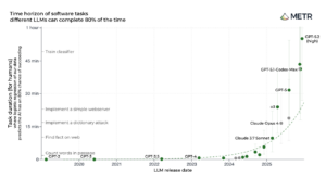 In March 2025, the AI research nonprofit METR introduced a metric called the task-completion time horizon to track the capability of AI agents. METR tests models on a suite of software engineering tasks, and also measures how long each task takes a human expert to complete (the task duration). The time horizon is the task duration at which a model is estimated to succeed at a certain level of reliability (e.g., 80%). For example, the point in the furthest upper right corner of the plot shows that GPT-5.2 can complete tasks that take human experts an hour with an 80% rate of success. The most capable models' time horizons have roughly doubled every seven months.