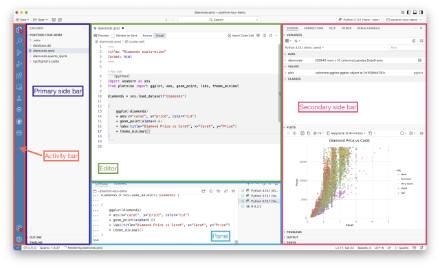 Positron builds on our years of experience developing RStudio and is a fork of VS Code, designed specifically for data work. This means you get a modern coding interface with features tailored for data science, like a built-in data explorer, AI assistance, interpreter management, and more.