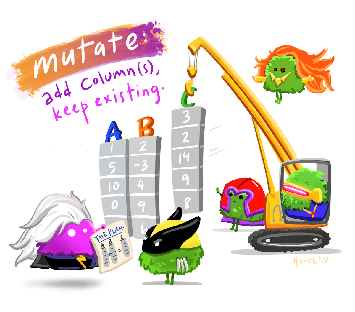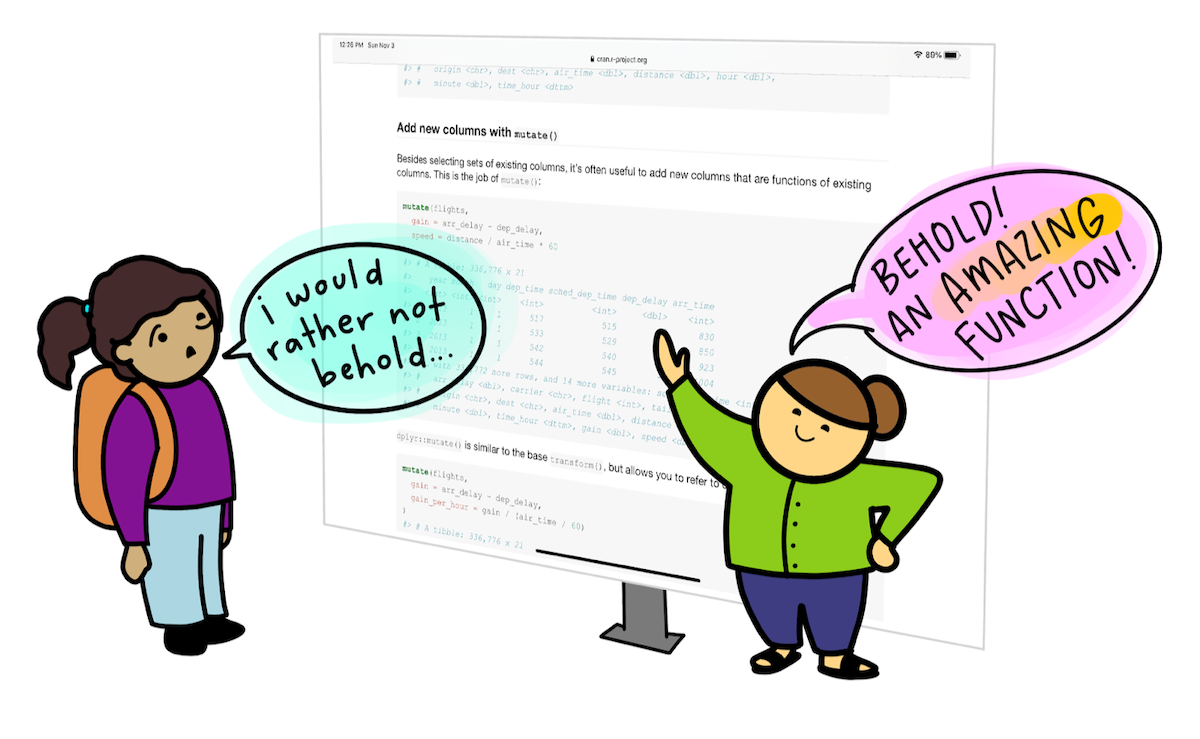 For example, instead of showing a chunk of code while trying to encourage students to learn dplyr::mutate(), their first sighting of the function would be mutant monsteRs working behind the scenes to add columns to a data frame, while keeping the existing ones: