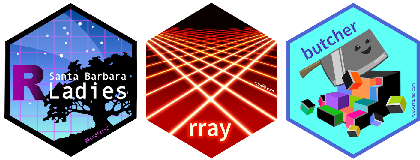 And, I’ve been working on hex designs for R-related groups and packages! Here are a few: the hex sticker for Santa Barbara R-Ladies (our growing local chapter of R-Ladies Global), the new rray package hex envisioned by Davis Vaughan, and a design for the butcher package from Joyce Cahoon and the tidymodels team: