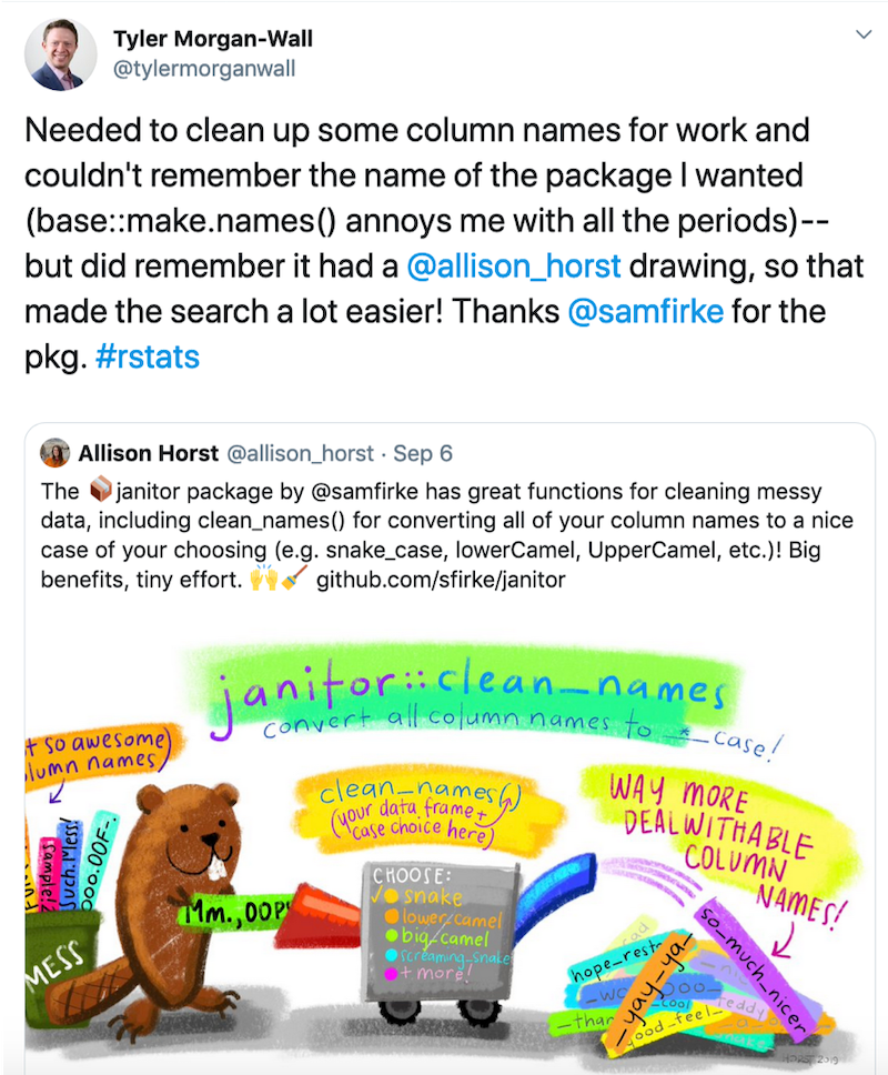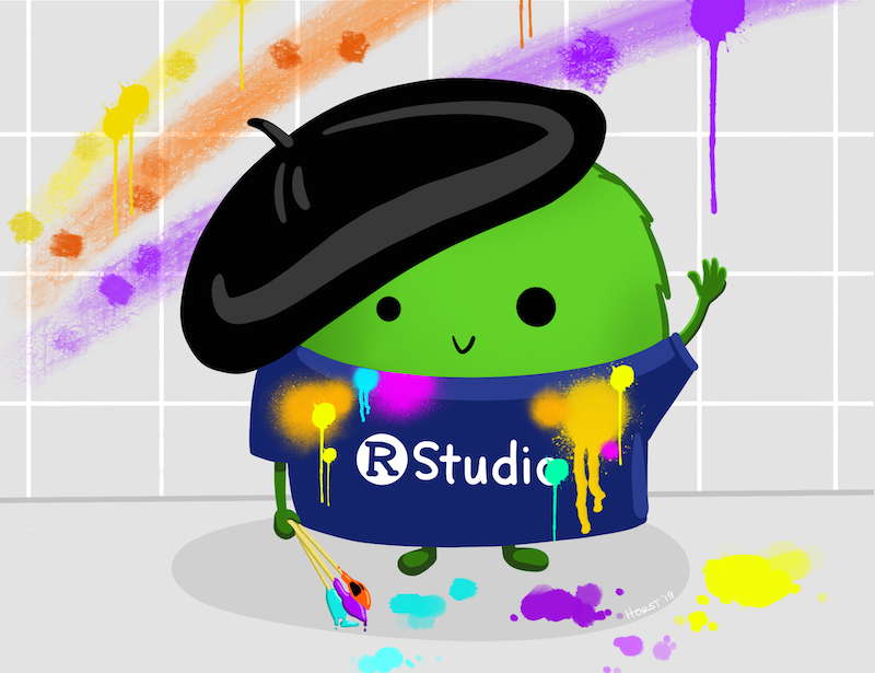 Some of you might know me from my R- and stats-inspired illustrations on twitter). I’m excited to share that, as of October 2019, I am an Artist-in-Residence with RStudio. My goal as an RStudio Artist-in-Residence is to create useful and engaging illustrations and designs that welcome users to explore, teach, and learn about new packages and functions in R. In this post, I’ll share what motivates me to create R-related artwork, and what I’ll be working on at RStudio.