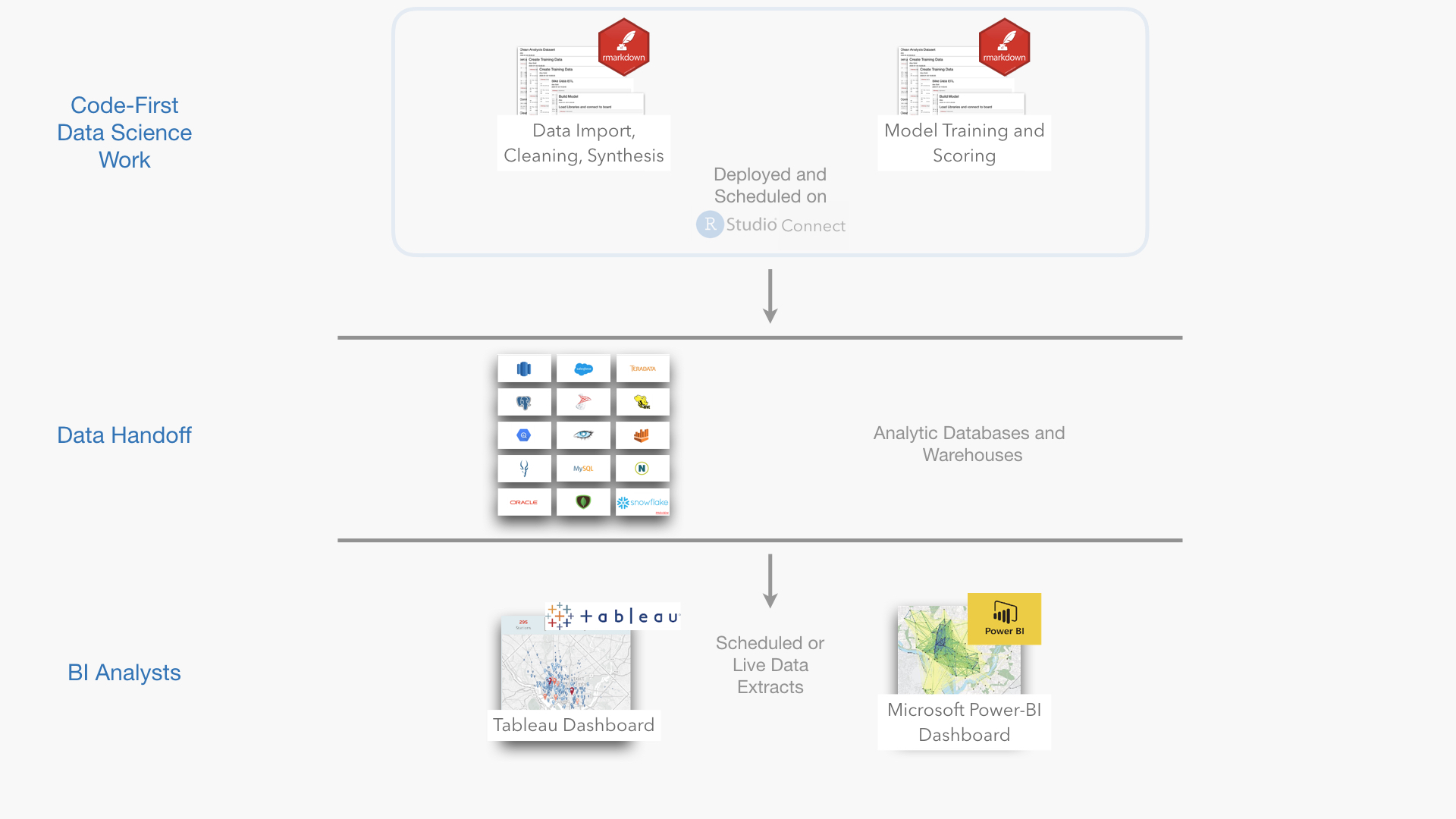 Future posts will address how data scientists and BI teams can overcome the limitations in the data handoff technique, and prior posts explore the relationship between BI and data science in more details. If you’d like to learn more about how RStudio products can help augment and complement your BI approaches, you can set up a meeting with our Customer Success team.