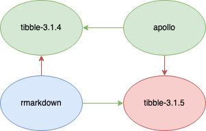 A dependency network showing two packages tibble-3.1.4 and apollo installed, the desired rmarkdown package and its incompatible dependency tibble-3.1.5.