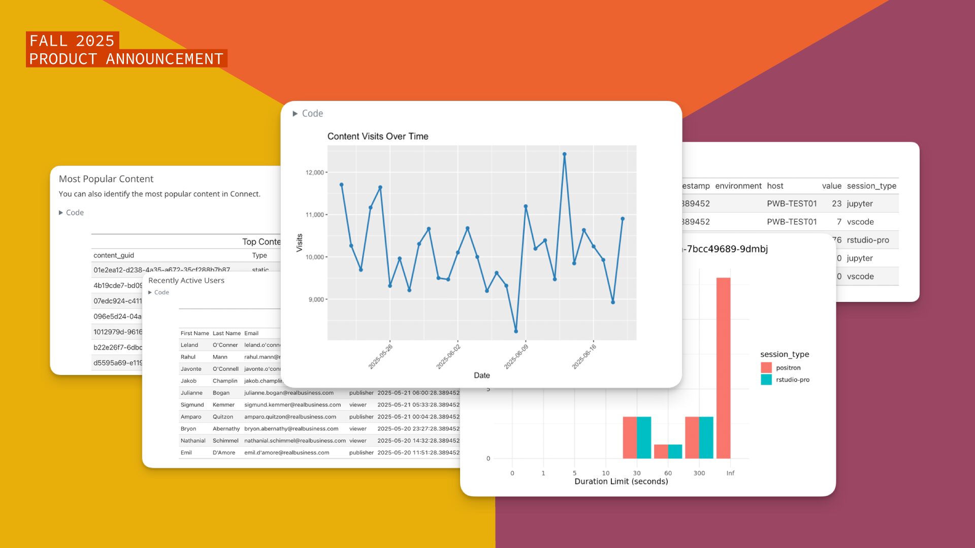 Posit Chronicle is an included visibility service designed to help data science managers and leaders understand their organization's use of Posit’s products, like Posit Connect and Posit Workbench. Turn usage metrics into actionable insights for proactive planning and growth that proves the value of your data science investment.