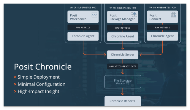 Chronicle is a free, included capability available now to all Posit customers – no separate license is required. Installation is simple, and only requires deployment of a single, centralized metrics collection server, along with a small telemetry agent alongside each server running Connect or Workbench.