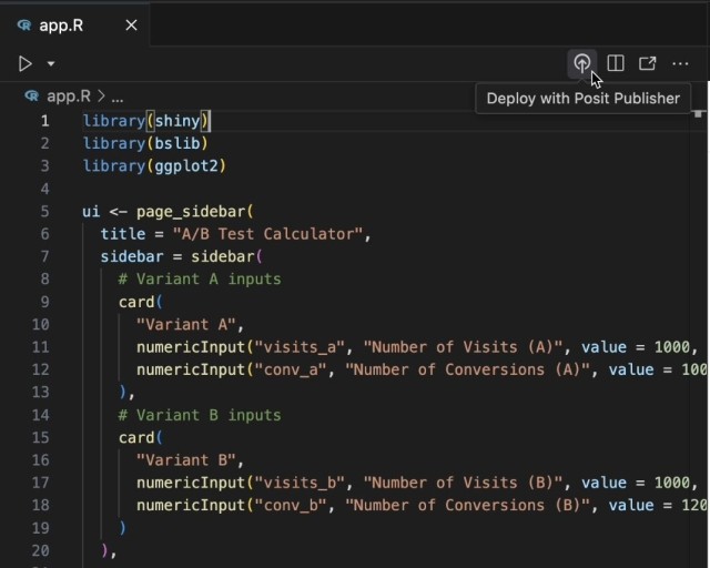 Once installed, you can access the extension from the Publisher icon on the Activity Bar or from the top of a deployable project file such as app.py, app.R, or index.qmd.