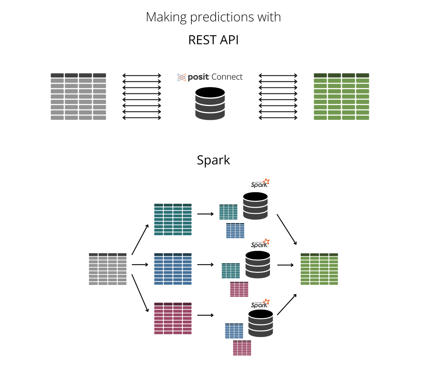 To address this, we can instead use UDFs. UDFs allow us to run R functions directly within the Spark environment, eliminating the need for repeated API calls. By using Spark, we can parallelize these requests. Parallelization divides a computational task into smaller subtasks that can be executed simultaneously across multiple processors. This not only reduces latency but also optimizes the use of Spark, ensuring faster, more reliable predictions without overloading an API server.