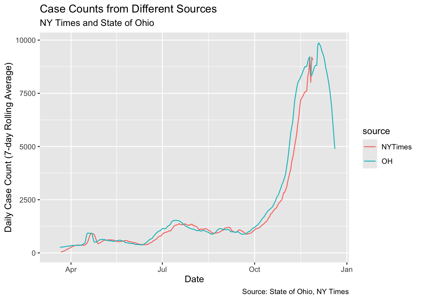 filter(onset_date >= cutoff_start)How comparable are these data sets? Let’s compare the NY Times case count and dates to the Ohio “Illness Onset” dates.