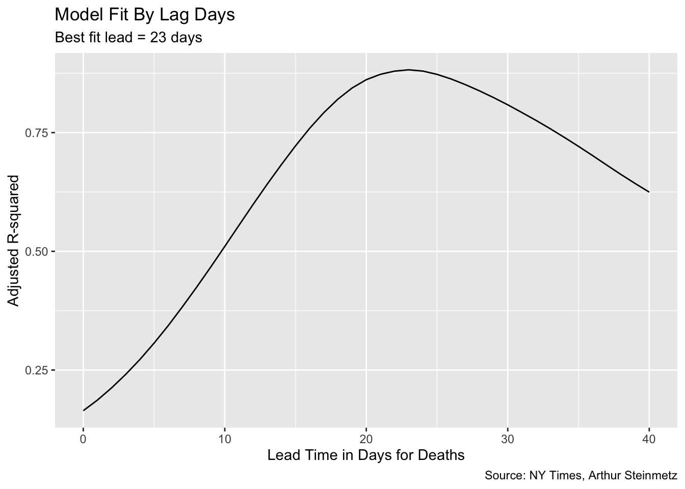 I have been thinking about how to measure mortality lags for a while now. What prompted to do a write-up was discovering a new function in Matt Dancho’s timetk package, tk_augment_lags, which makes short work of building multiple lags. Not too long ago, managing models for multiple lags and multiple states would have been a bit messy. The emerging tidymodels framework from RStudio using list columns is immensely powerful for this sort of thing. It’s great to reduce so much analysis into so few lines of code.