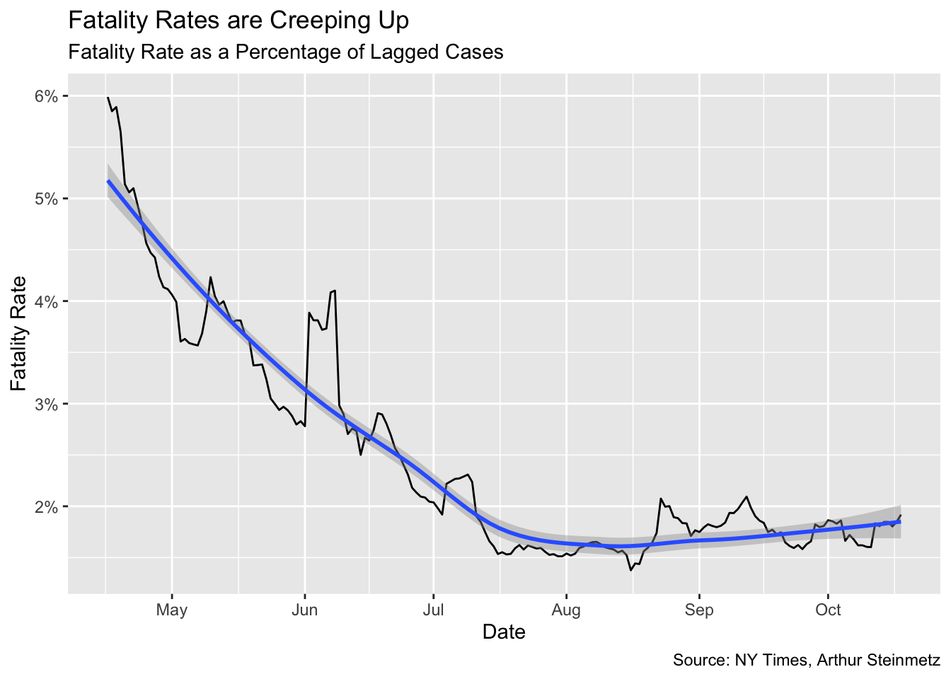 Among the vexing aspects of this terrible pandemic is that we don’t know what the gold standard is for treatment and prevention. We are learning as we go. The good news is we ARE learning. For a data analyst the challenge is the evolving relationship of of all of the disparate data. Here we have gotten some insight into the duration between a positive test and mortality. We can’t have high confidence that our proxy model using aggregate cases is strictly accurate because the longitudinal data from Ohio shows a different lag. We have clearly seen that mortality has been declining but our model suggests that death will nonetheless surge along with the autumn surge in cases.