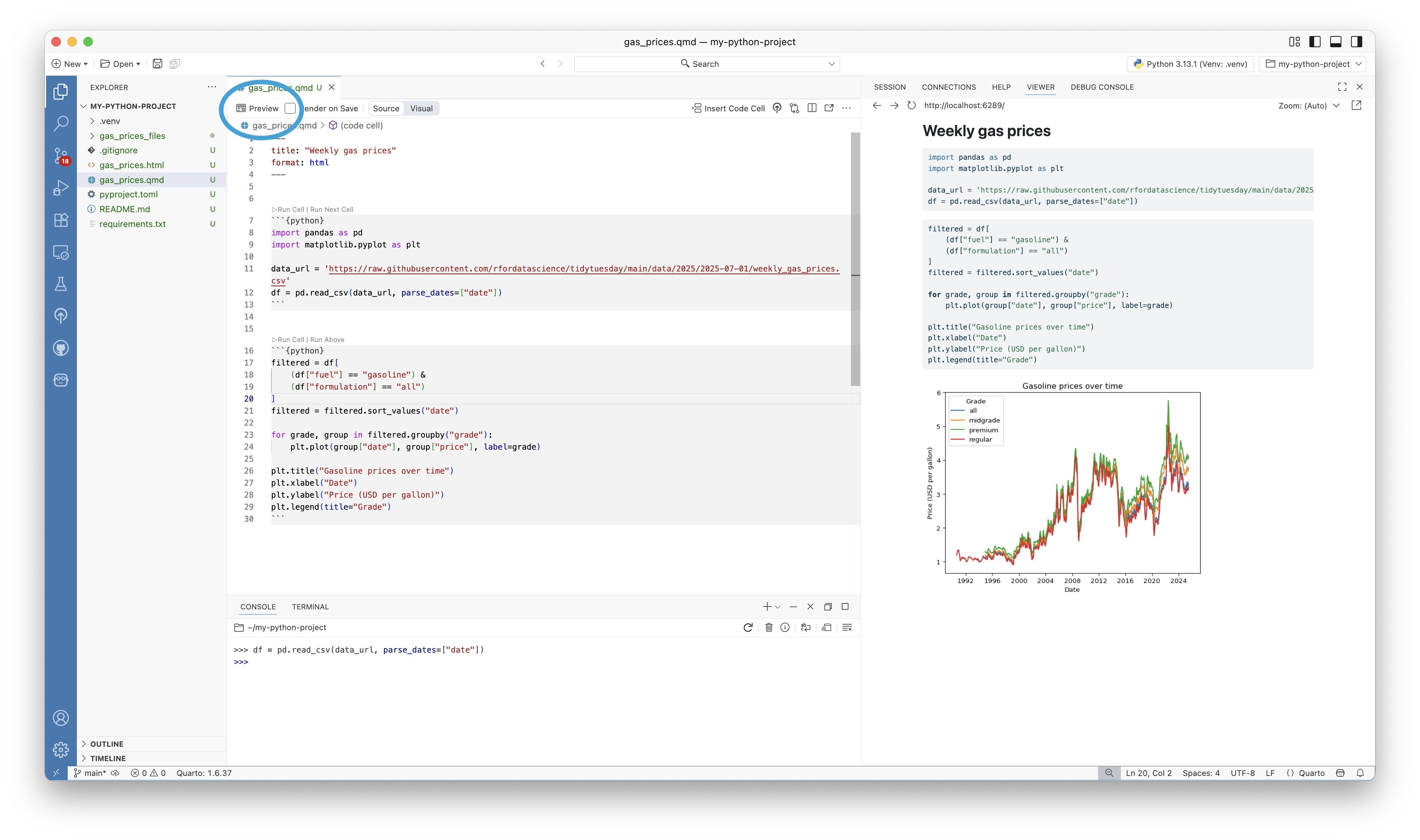 Next, let’s plot the data. Copy and paste the following code into a new cell in your Quarto document.