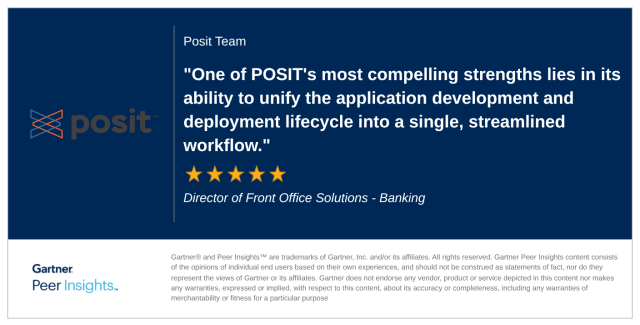 Director of Front Office Solutions in the Banking Industry gives Posit Team 5/5 Rating in Gartner Peer Insights™ Data Science and Machine Learning Platforms Market. Read the full review here: https://gtnr.io/lWGLrEYvI