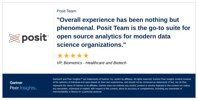 VP, Biometrics in the Healthcare and Biotech Industry gives Posit Team 5/5 Rating in Gartner Peer Insights™ Data Science and Machine Learning Platforms Market. Read the full review here: https://gtnr.io/vExUEPCPv