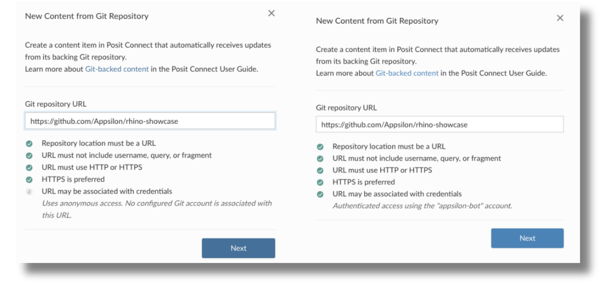 In the image below, you’ll see two configuration pop-ups. On the left, you can see that the Connect is not configured with a Git account, and on the right, you can see that it is configured with a Git account, “appsilon-bot”.