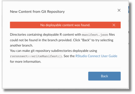 If you stumble upon this error in the next step, the branch you selected does not contain the manifest.json as detailed in the error message. You should run rsconnect::writeManifest() and generate the manifest.json and do the previous step again.