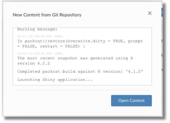 After clicking the Deploy Content, you should see the progress of the deployment, after which you can open and view the deployed app.
