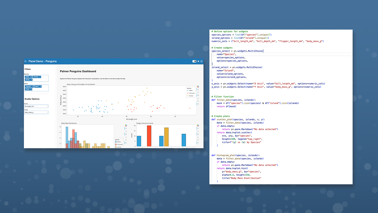 Posit Connect now includes support for the Panel framework, expanding its capabilities to host a wider range of Python frameworks. Panel is an open-source Python library that lets you create custom interactive web apps by connecting user-defined widgets to plots, images, tables, or text. Part of the Holoviz family of Python libraries, Panel is a widely used framework to share dashboards and other visualizations.