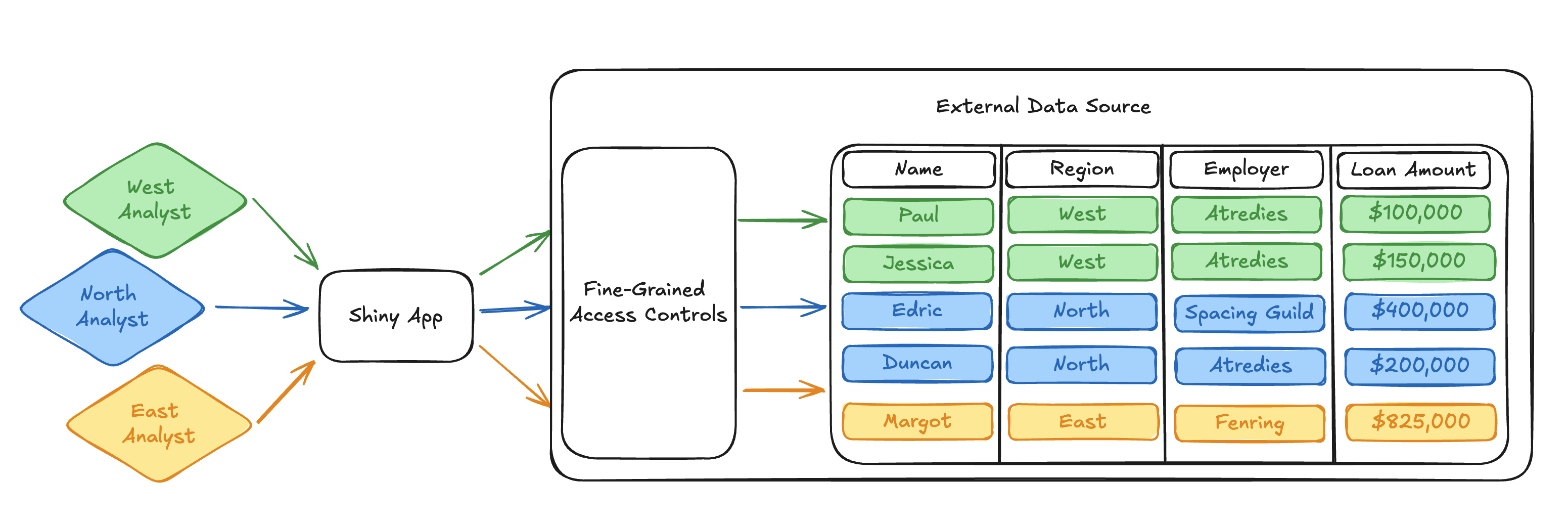 Importantly, this means that a single interactive app can dynamically query for data using the identity of the viewer, rather than relying on static service account credentials when querying data from an external platform. One deployment can now serve many different user personas while transparently relying on the external platform to manage the permissions and restrictions associated with that viewer.