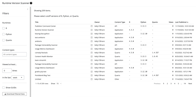 What it does: Shows you which published content is running on specific versions of R, Python, or Quarto, allowing you to filter down to only content on older versions.