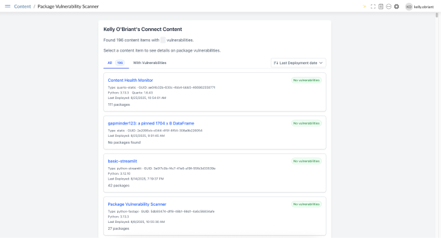 What it does: Identifies published content using packages with reported security vulnerabilities, pulling data directly from Posit Package Manager.