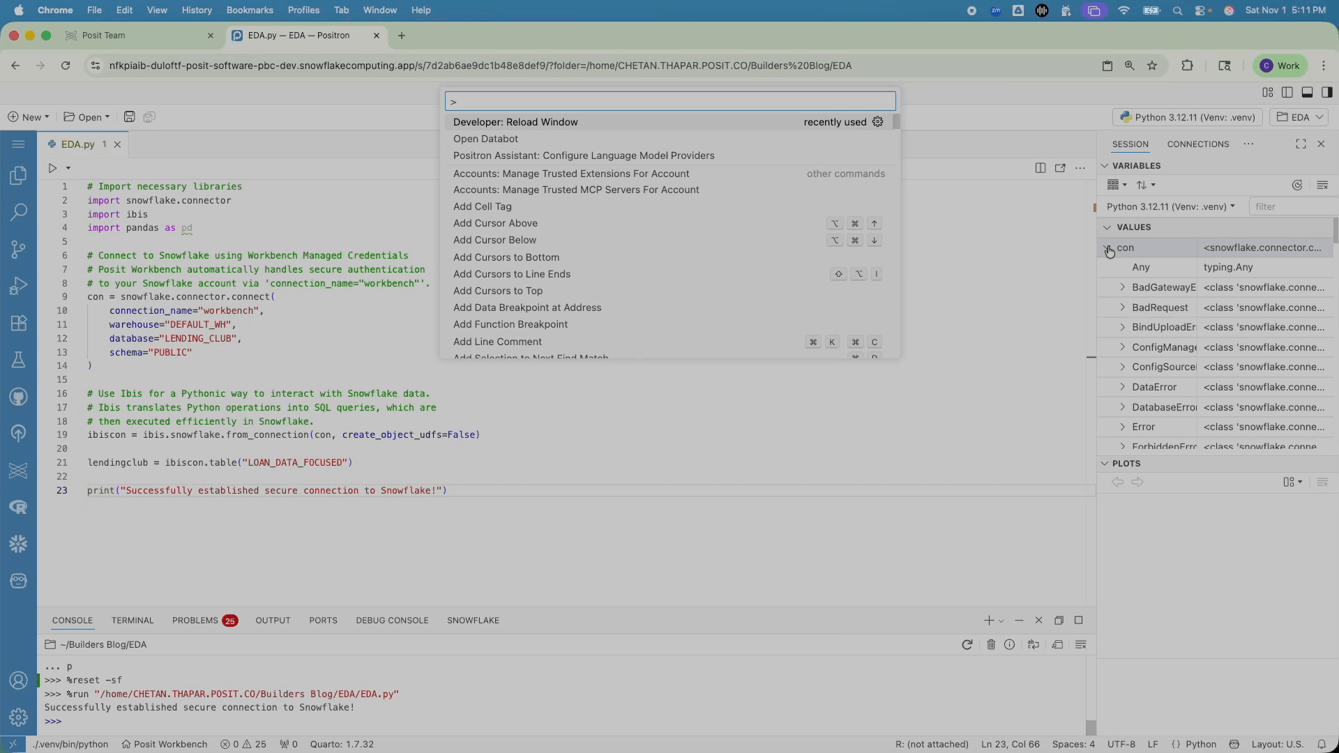 For the foundational (and often, most time-consuming) part of any data project, we’ve introduced Databot in Positron. Databot is an AI agent designed to accelerate exploratory data analysis (EDA). If you give Databot a high-level instruction, it will write and execute code, analyze the output, and suggest the next steps, keeping you in the loop the entire time. Because it has access to the context of your IDE, it understands your dataframes and variables, allowing it to generate precise and relevant code. It's also efficient, pushing down queries to Snowflake to minimize data movement.