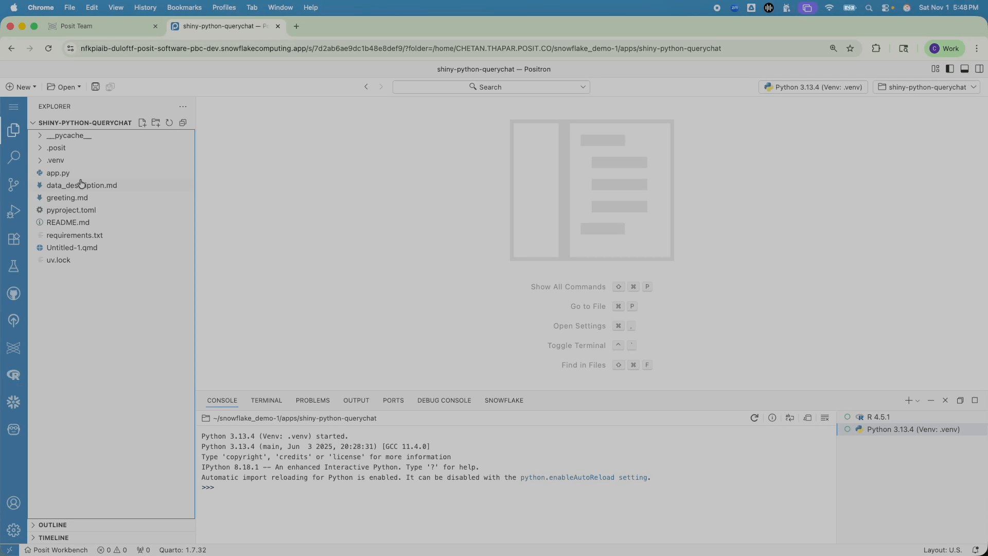 The deployed application can provide an interactive, natural language interface for exploring your data. By using open-source packages like querychat and chatlas, your app can leverage Snowflake Cortex to translate user questions into SQL.