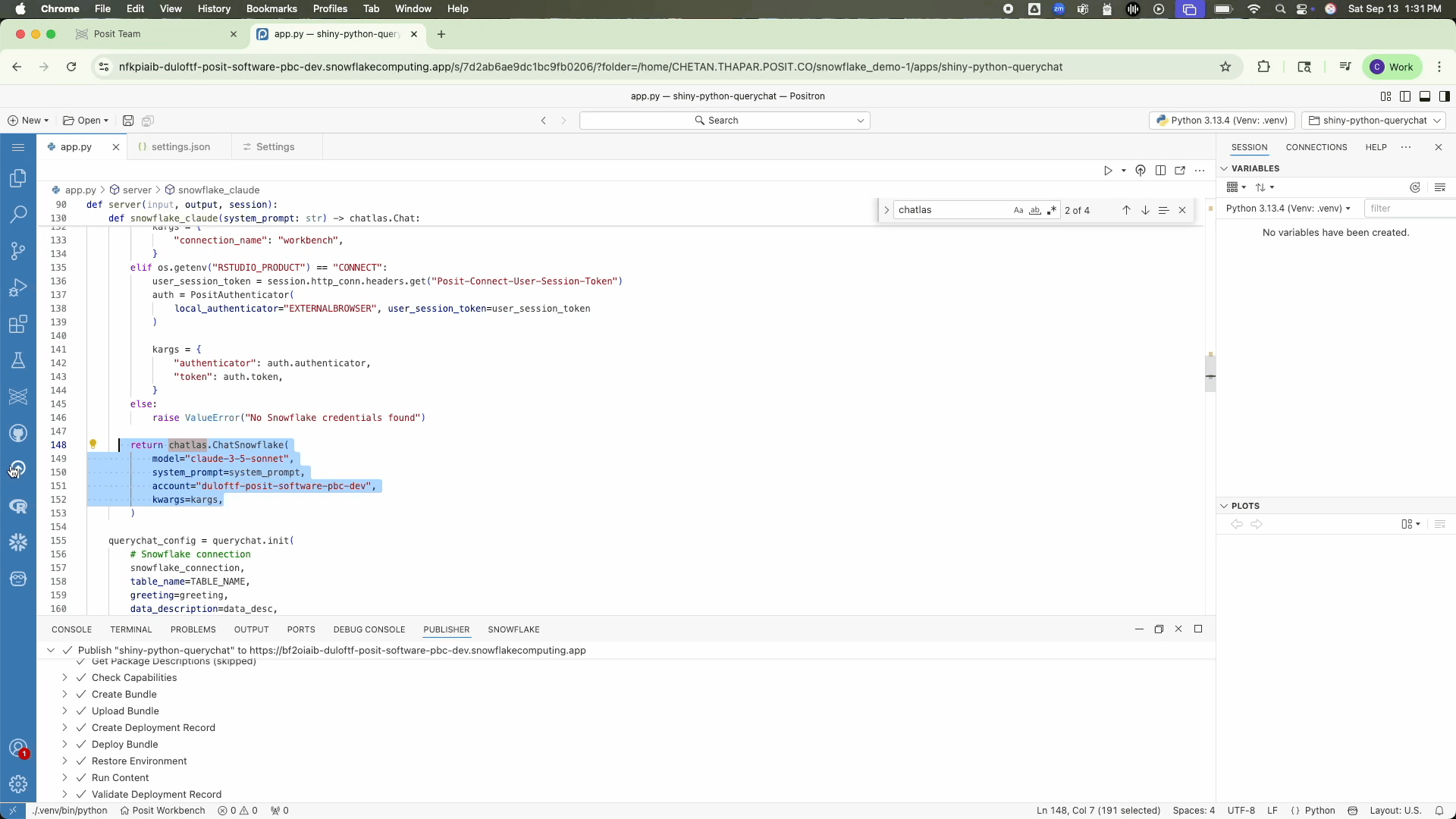 Once your app is ready, you can deploy it to Posit Connect with a single click from your IDE. Because Workbench and Connect are running in the same Native App, the complex network and authentication challenges of connecting separate development and deployment environments are eliminated. Posit Connect handles the dependencies and ensures your code runs successfully as a deployed artifact.