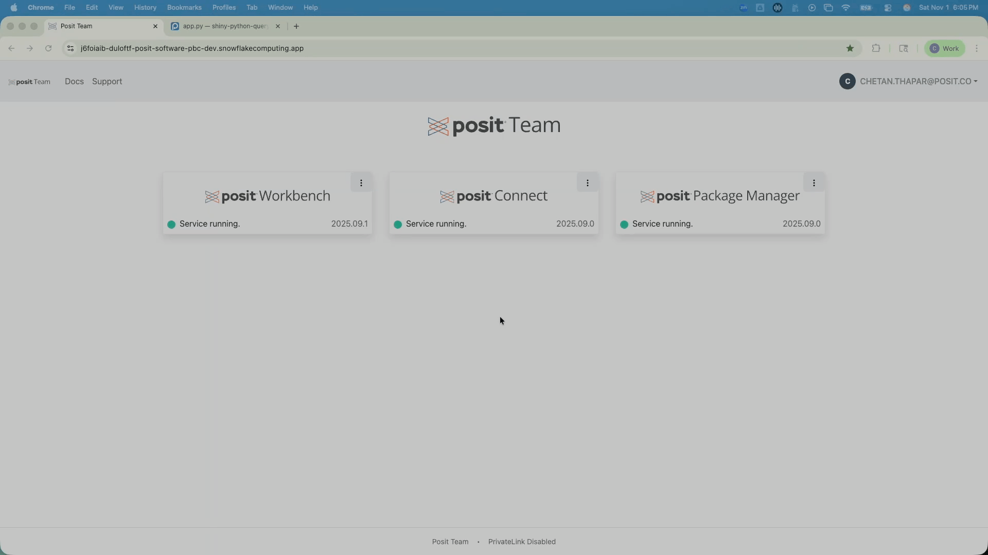 Today, we are proud to announce our answer: the Posit Team Native App on Snowflake. With this app, your team can manage its entire data science lifecycle—from development to deployment—without data ever leaving the Snowflake security boundary.