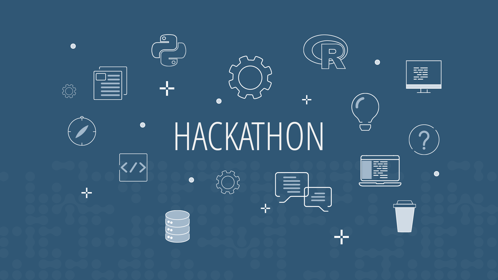 A dark blue graphic with white text 'HACKATHON' in the center. Surrounding the text are various white line icons related to programming and data science, including the Python logo, the R logo, code brackets, a database cylinder, a computer screen, a laptop with code, chat bubbles, a lightbulb, a question mark, gears, a document, a compass, a coffee cup, and plus signs and dots connecting some of the elements. The background has a subtle pattern of light blue dots and squares.