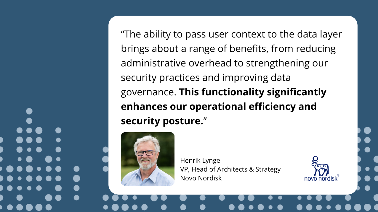 The ability to pass user context to the data layer brings about a range of benefits, from reducing administrative overhead to strengthening our security practices and improving data governance. This functionality significantly enhances our operational efficiency and security posture. --- Henrik Lynge, VP, Head of Architects & Strategy, Novo Nordisk. A headshot of Henrik Lynge.