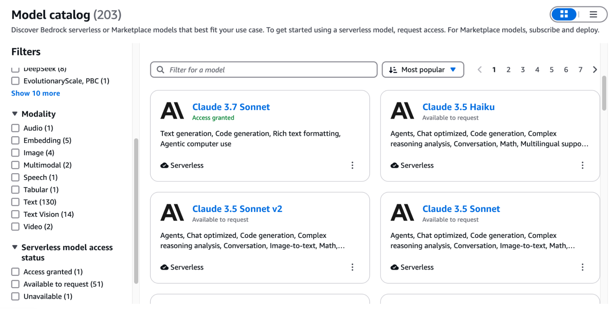 2. Configure access to Amazon Bedrock: You can configure access to Amazon Bedrock foundational models by following the instructions here. Once access has been configured, visiting Bedrock in the AWS console should show a list of available models and indicate which are currently accessible: