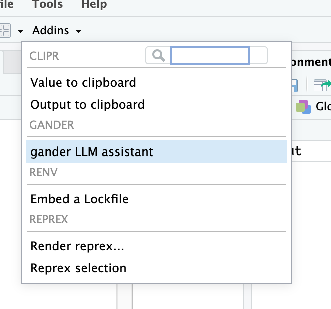 1. Natural language exploratory data analysis. Now that gander has been configured, it can be accessed via the “Addins” menu within RStudio: