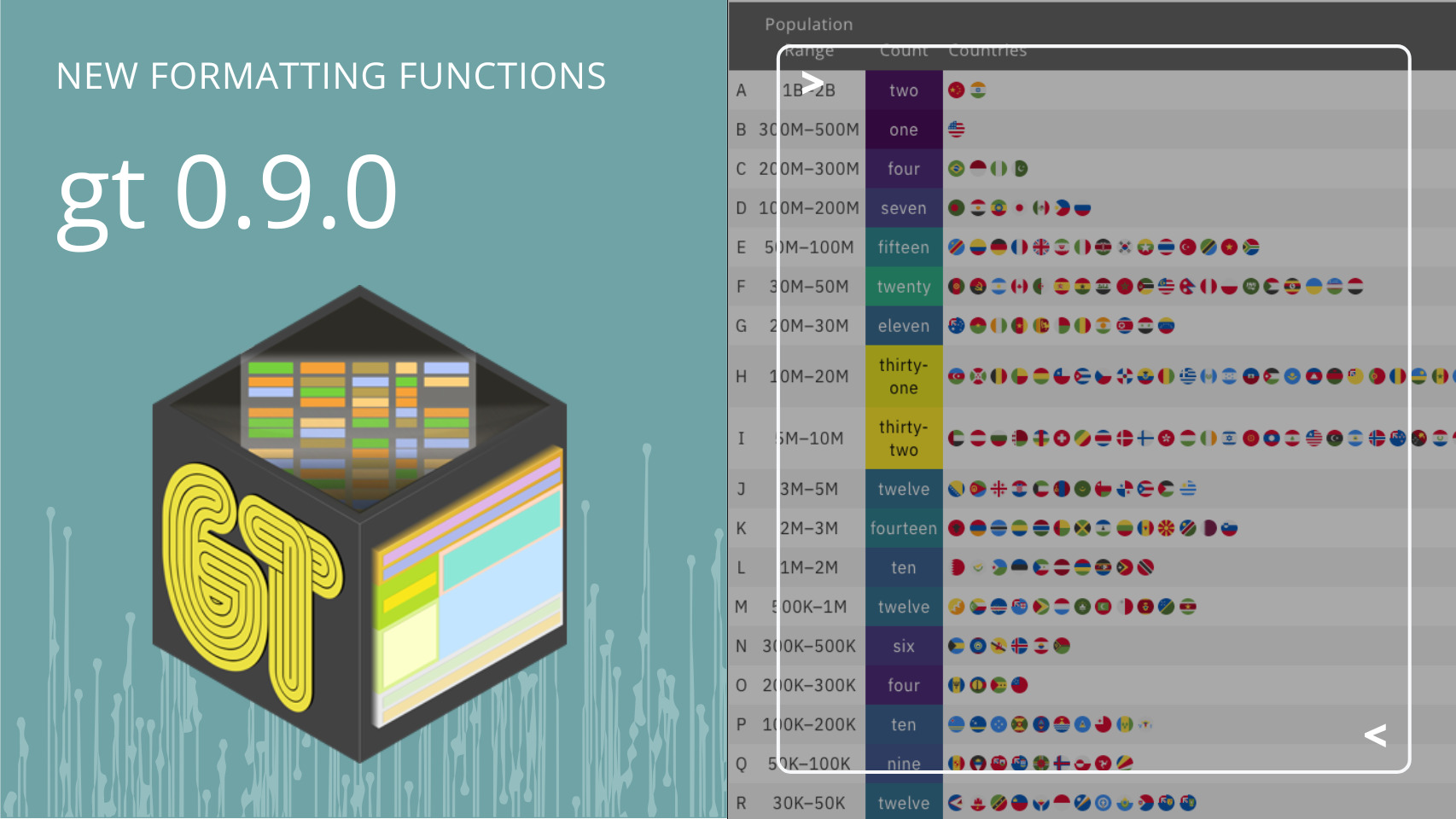 A new version of gt is out: version 0.9.0. Is it a big release? Yes, very much so. It’s not at all possible to cover everything that is new in just one blog post. Instead, we’re going to spread the gt goodness over a great many blog posts. This is the first of those, and we’re going to learn all about the new formatting functions in gt 0.9.0.