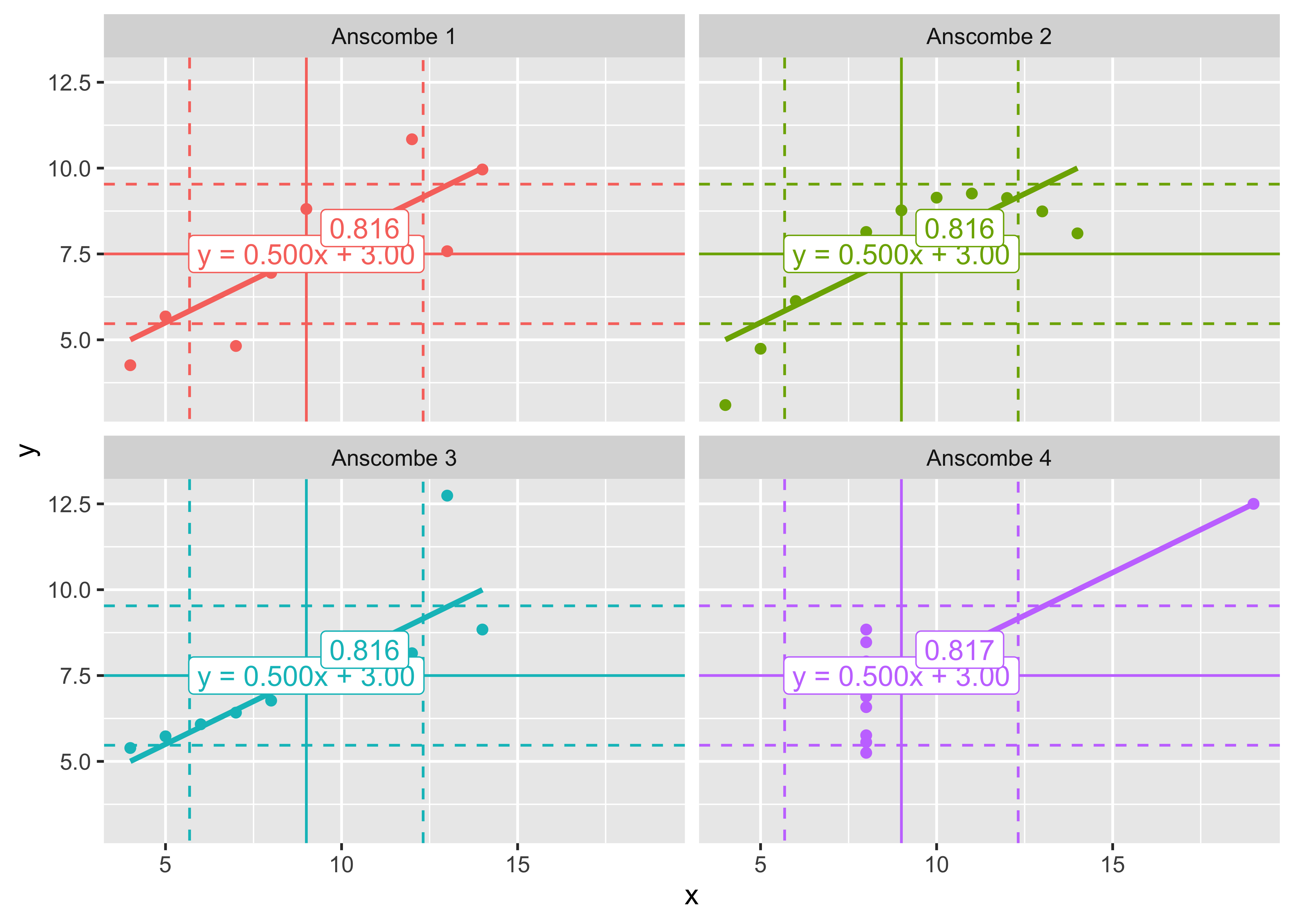Morgan and Madison took up the question of data outliers. Here, we apply their work to famous toy datasets: Anscombe’s quartet and the datasauRus Dozen. With the functions I’d worked on, we can visualize the summary statistics (mean, sds, correlation) that are typically the subject of discussions of Anscombe’s quartet and the datasauRus Dozen. This is shown here: