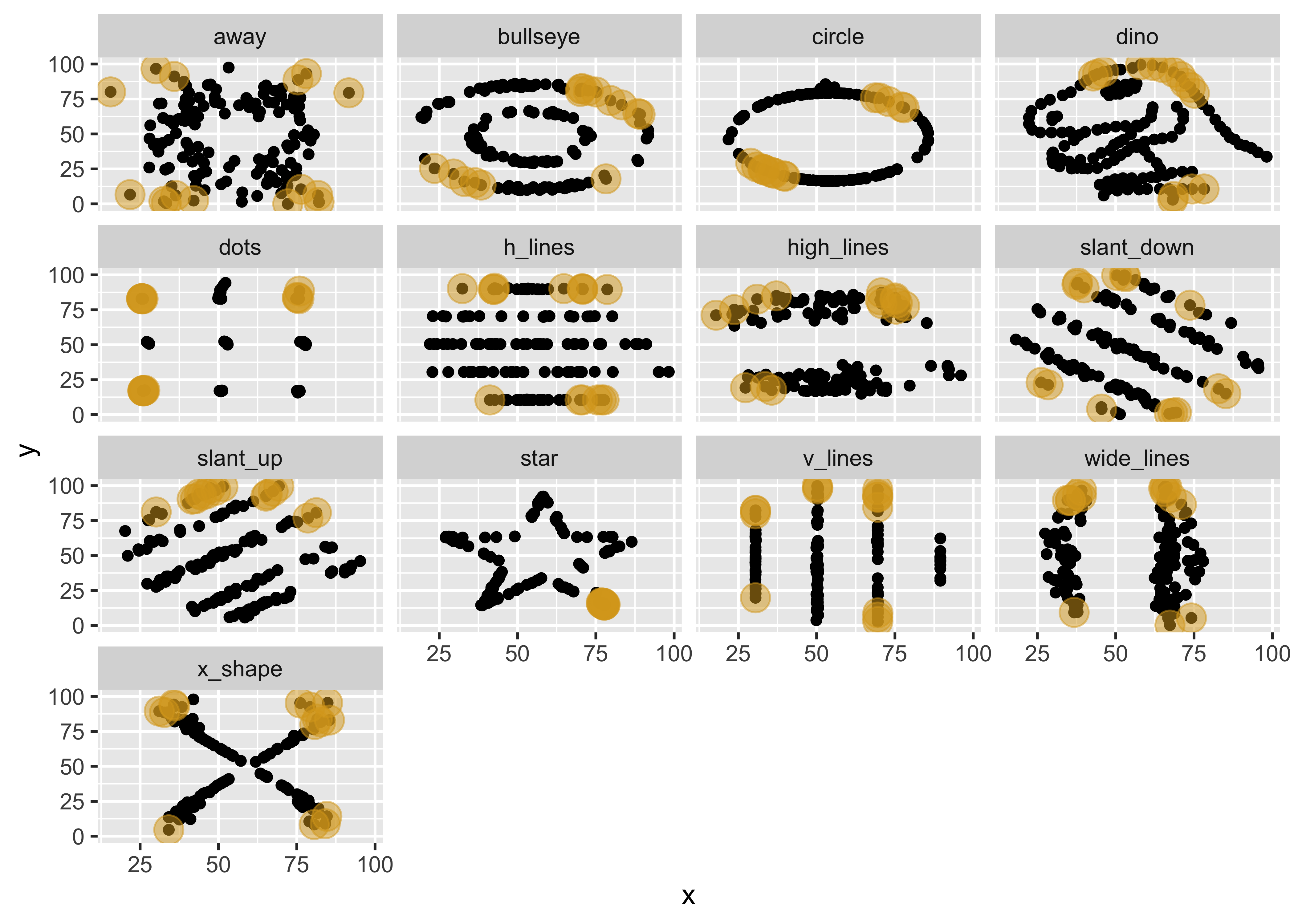 And in the datasauRus::datasaurus_dozen, Madison’s geom_point_high_cooks() highlights the 10% most influential observations: