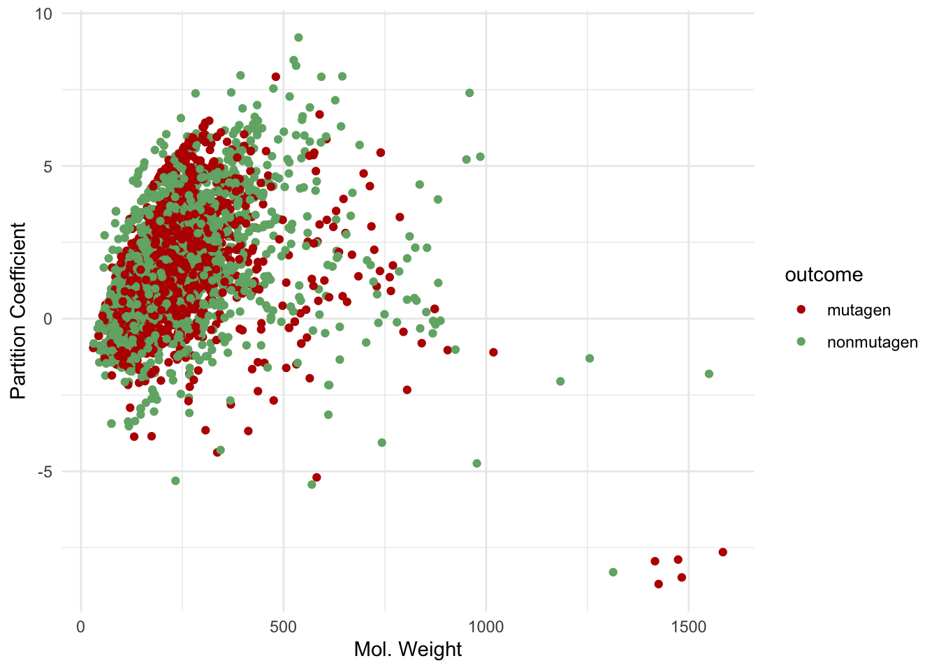 No particular predictor will allow us to straightforwardly predict whether a drug may be a mutagen. We can plot two commonly used predictors against the outcome to demonstrate: