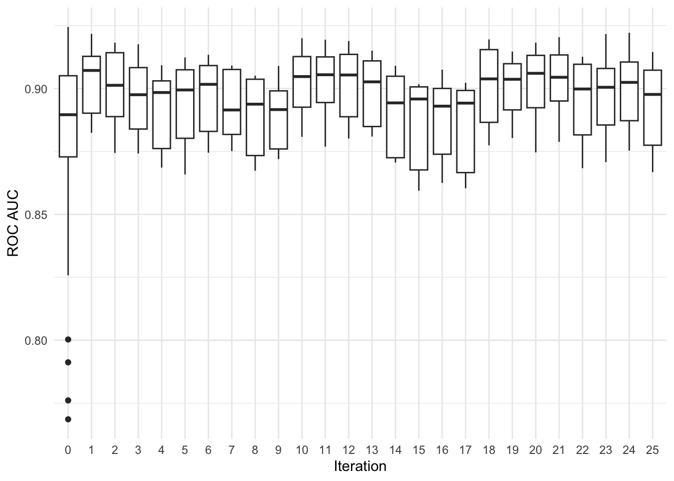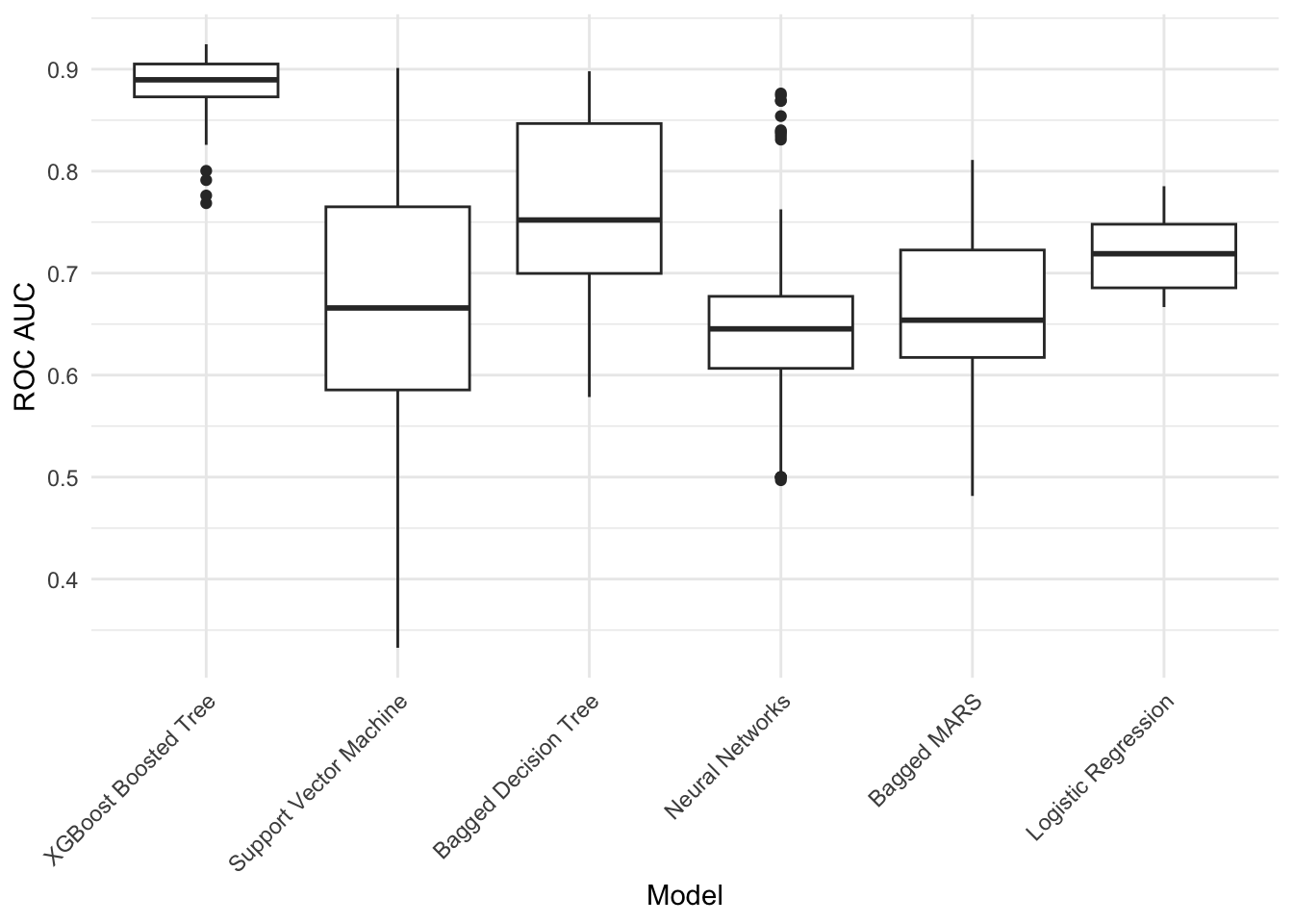 Based on the above plot, we see that a boosted tree model fitted with XGBoost consistently outperforms other models we evaluate, with out-of-sample ROC scores above 0.85 (a value of 1.0 is best). We will thus use these initial results to optimize our XGBoost model further with an approach called simulated annealing: