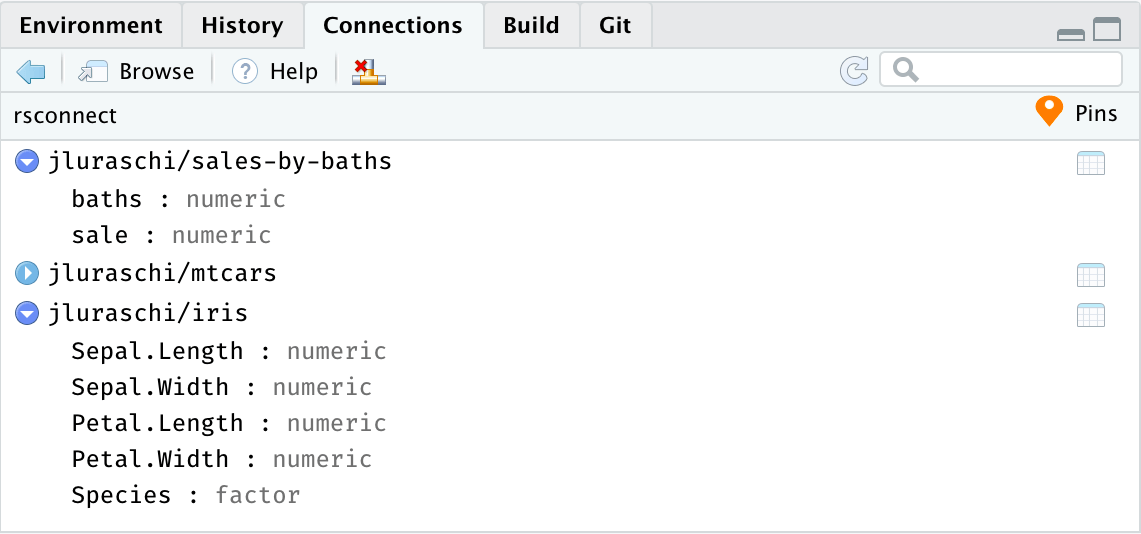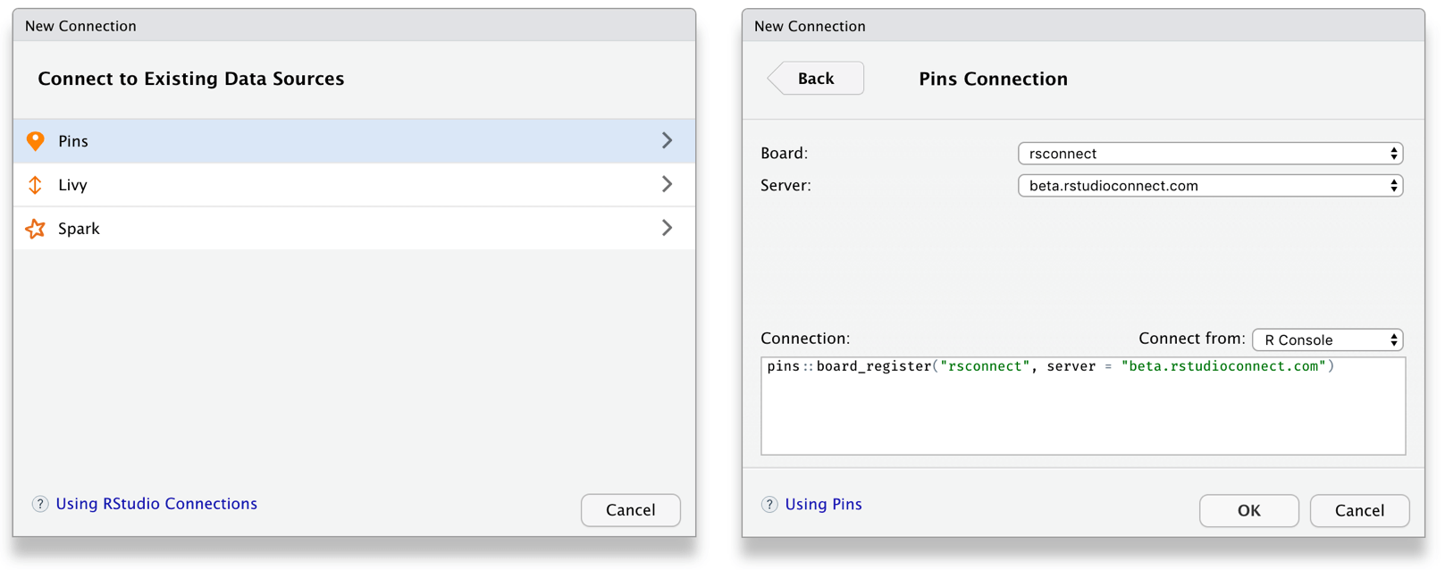 To enable new boards, like Kaggle and RStudio Connect, you can use RStudio’s Data Connections to create a new ‘pins’ connection, which provides you access to many boards: