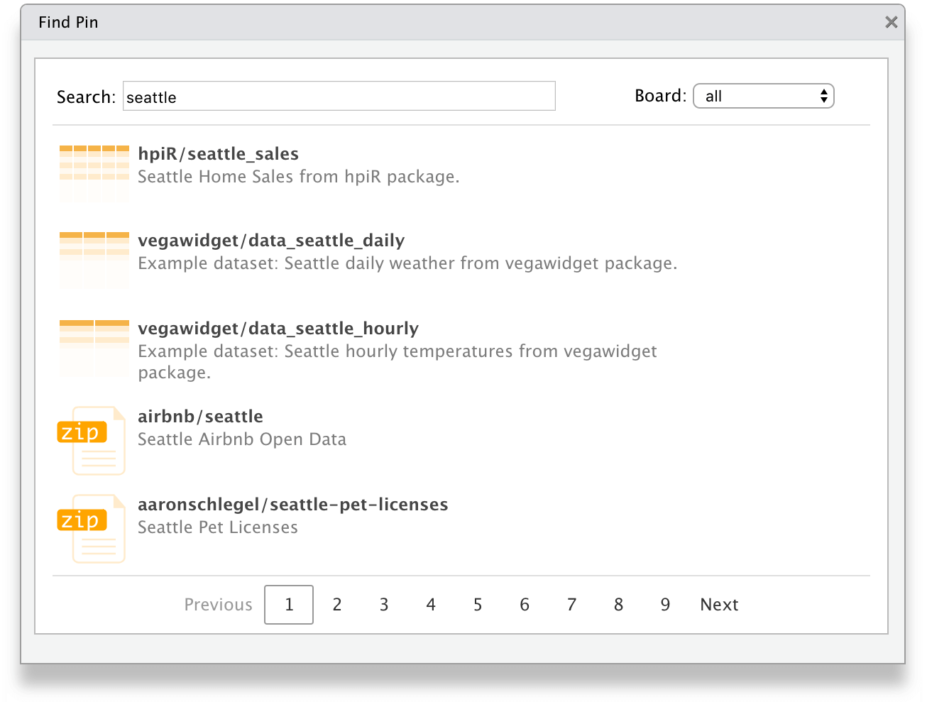 The pins package allows you to discover remote resources using pin_find(), currently, it can search resources in CRAN packages, Kaggle and RStudio Connect. For instance, we can search resources mentioning “seattle” in CRAN packages as follows: