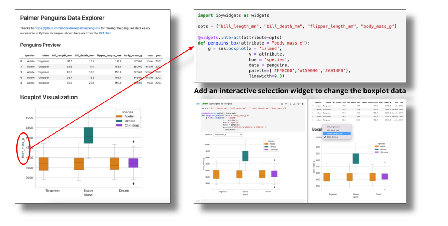 Say you wanted to present the visualization for each of the other penguin body measurements. Instead of replicating the plot or refactoring the entire notebook to create an application, turn the boxplot into a function and add a dropdown selection widget. The live Jupyter kernel allows users to interact with code once the notebook is deployed to Connect.