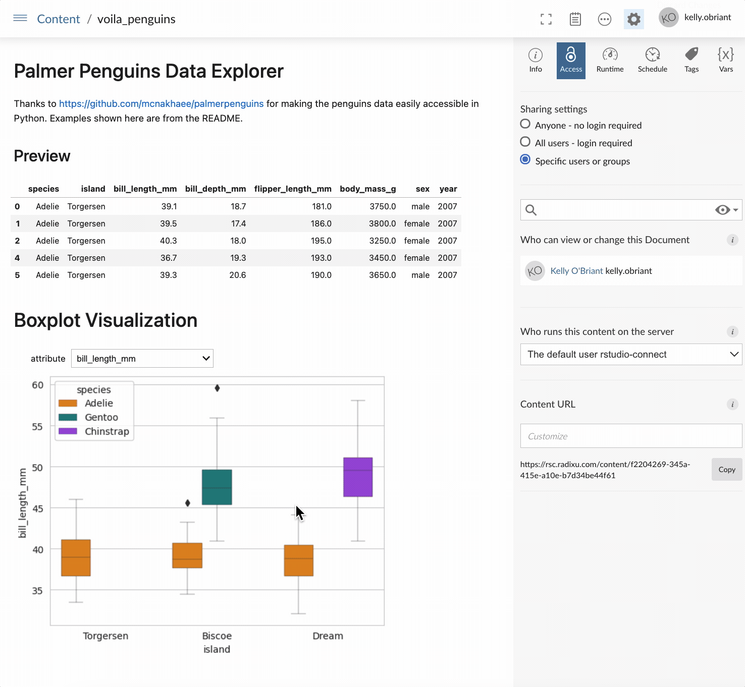 rsconnect deploy voila -n my_server penguins.ipynb - Standard Notebook Publishing:
