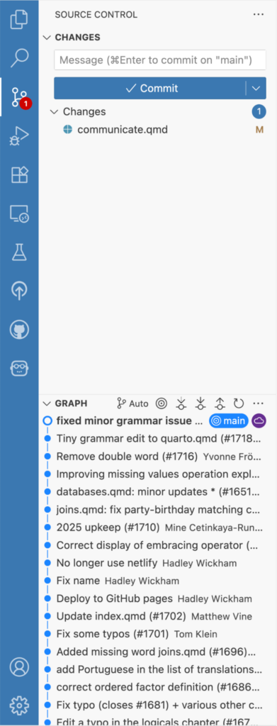 This is probably my favourite thing about Positron. The GitHub interface in RStudio was ok, but I still found myself using the command line, which felt like it interrupted my flow of work to a degree. Positron provides the ability to never have to leave the IDE. Once you have authenticated your GitHub account in Positron, you can click the GitHub icon in the activity panel to see all the pull requests and issues for that repo. You can create PRs from that menu too – it’s all self-explanatory and works really well. Clicking on one of your repo issues will also open it as an additional tab in the editor pane, and you can interact with it there just as you would at github.com! No need to have browsers and shells open, it’s all just there. This helps my workflow massively, allowing me to keep my train of thought going.