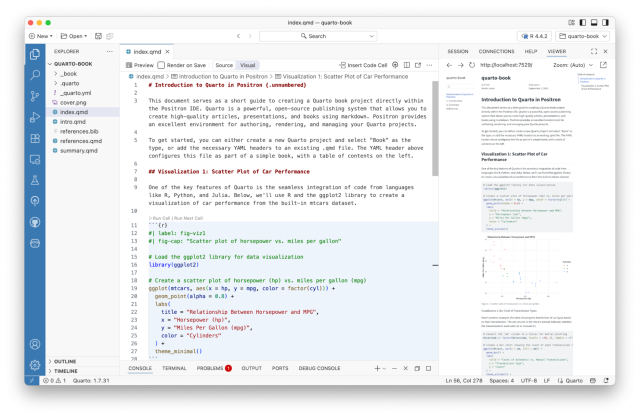 Quarto, which is already bilingual, is the tool I use to write meeting notes, lists, and plans, all within a locally version-controlled Quarto book. The whole book is searchable, so it’s easy to find the notes I’m looking for, and Positron makes working with Quarto very easy. Positron comes with a bootstrapped Quarto extension,n and the CLI is bundled with Positron, so no extra setup is needed. I can create my planning documents, with nice mermaid flow diagrams and such, and I can publish them easily from Positron to share with my team. I’ve written a package that I can use within the IDE to automatically append notes to any of the .qmd pages of my notes book. I can even create diagrams and charts in the IDE and save them in my notes. If the diagram is complex, I can append the code chunks and output to my book too, since that’s what Quarto is great at.